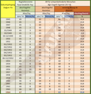 Örnek 3: 01.01.1969 doğumlu ve 35 yıl sigortalılık süresini tamamlayan ağır engelli sigortalı 01.01.2031 tarihinde 62 yaşını tamamlar. En erken kesintili olarak emekli aylığına hak kazanır. Bu sigortalımız diğer örneklerden farklı olarak 01.01.1964 tarihinden sonra doğduğu için kesintisiz tam yasal emeklilik yaşı (abschlagsfreie Regelaltersgrenze) 65 yıl şartını 01.01.2034 tarihinde yerine getirir.